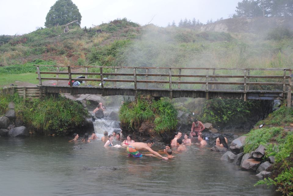 Now a very interesting fact- the huge crater lake which Taupo surrounds can fit the whole of Singapore inside!! We decided to go to the geothermal spa which was amazing. We'd only heard of this before but it was fun to look at and very exciting to bathe in. The flowing water and the pools are very hot (like going in a bath but it won't cool down). We relaxed and enjoyed the heat, Shan along with all the other dudes jumped from the bridge into the water too. It was really good, and seeing as it was still a little rainy it was the best thing we could do. All other possible tours had been cancelled due to weather. At night we got a cheap meal at our hostel 'Urban Retreat'. Then we went to an Irish bar for some more Kiwi beers.