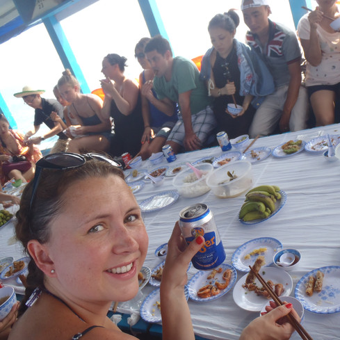 But when we got picked up at 0845 the next morning, we seen couples in our mini bus and then on boat people asleep and people that didn't look like they were up for a party. The Vietnamese man who was called Morgan, as he looked similar to Morgan Freeman was in the mic like yeaaah all ready to paaarty, and people were like no. So we enjoyed a leisurely sail to the first island where we went snorkelling and seen a few different type fishes but it wasn't the best place we have been and it was a pain getting in and out the water as the rocks were super slippy. We had a few hours there so afterwards we sunbathed on the dry rocks.