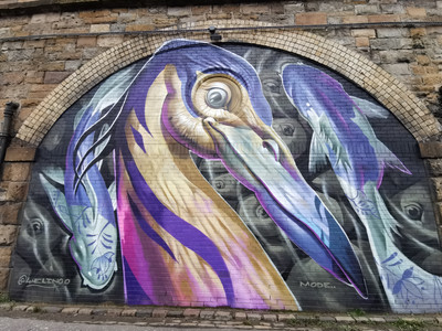Like a real crocodile hiding in the shallows- this piece is at first hard to notice, as it hides underneath a well-used bridge, the crocodile has a 3D effect as it is wrapped around the corner of the walkway and from certain angles looks like it’s coming for you. Note the crocodile’s eye which has been strategically placed in a gap of the brick work to give the full eye effect!